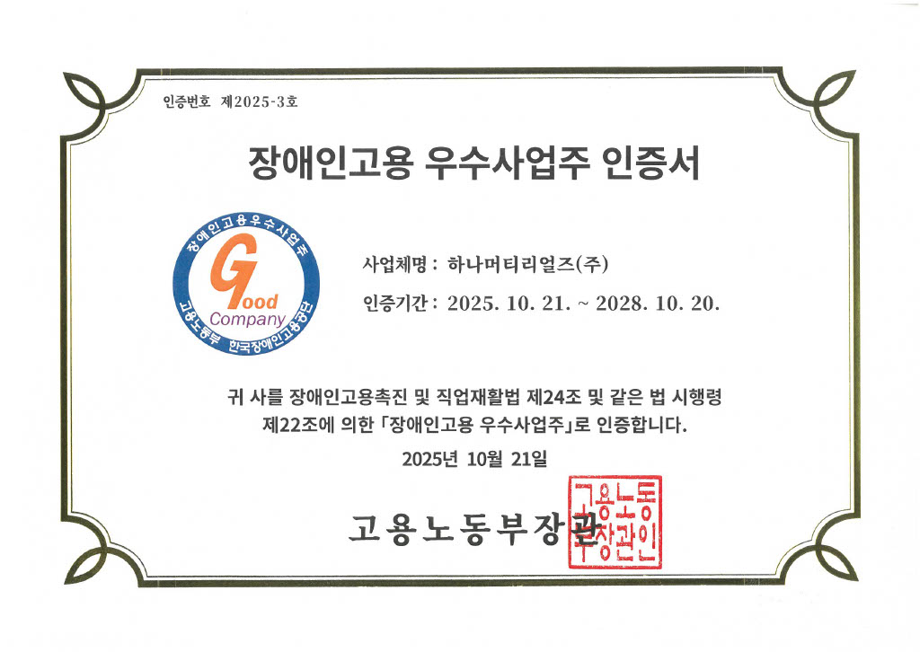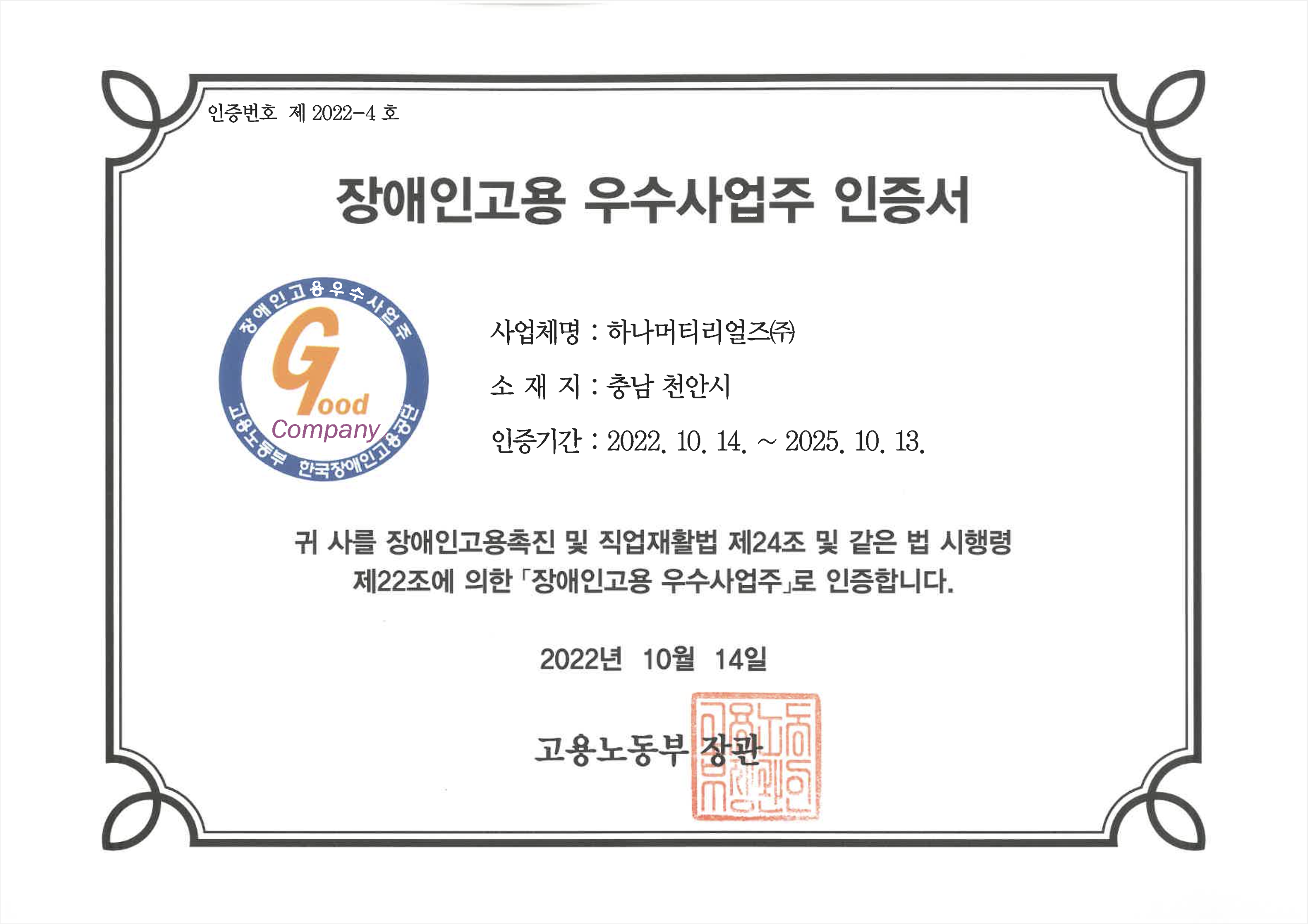 장애인 고용 우수사업주 인증서